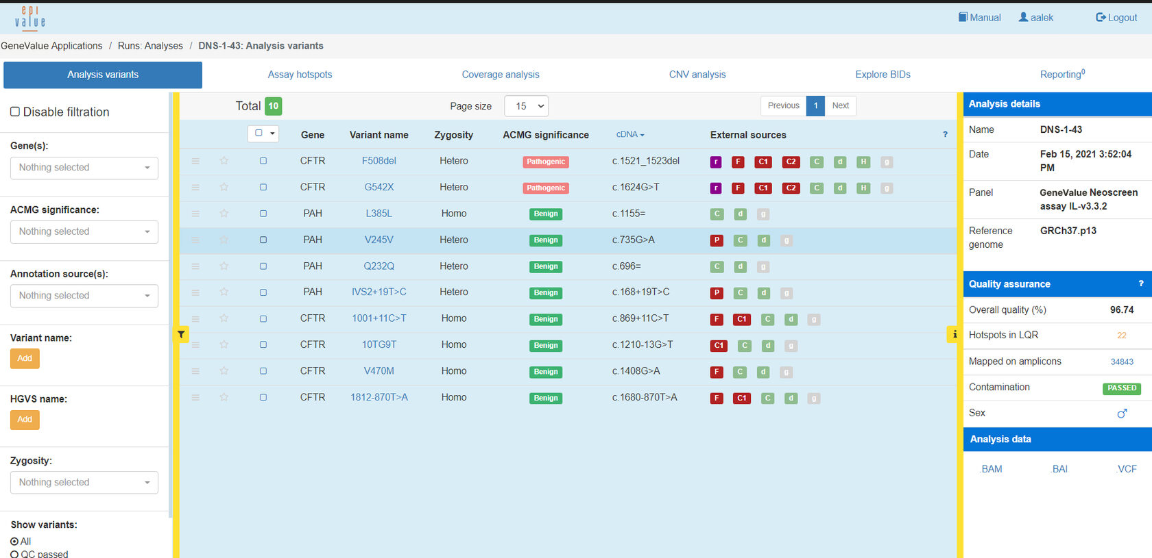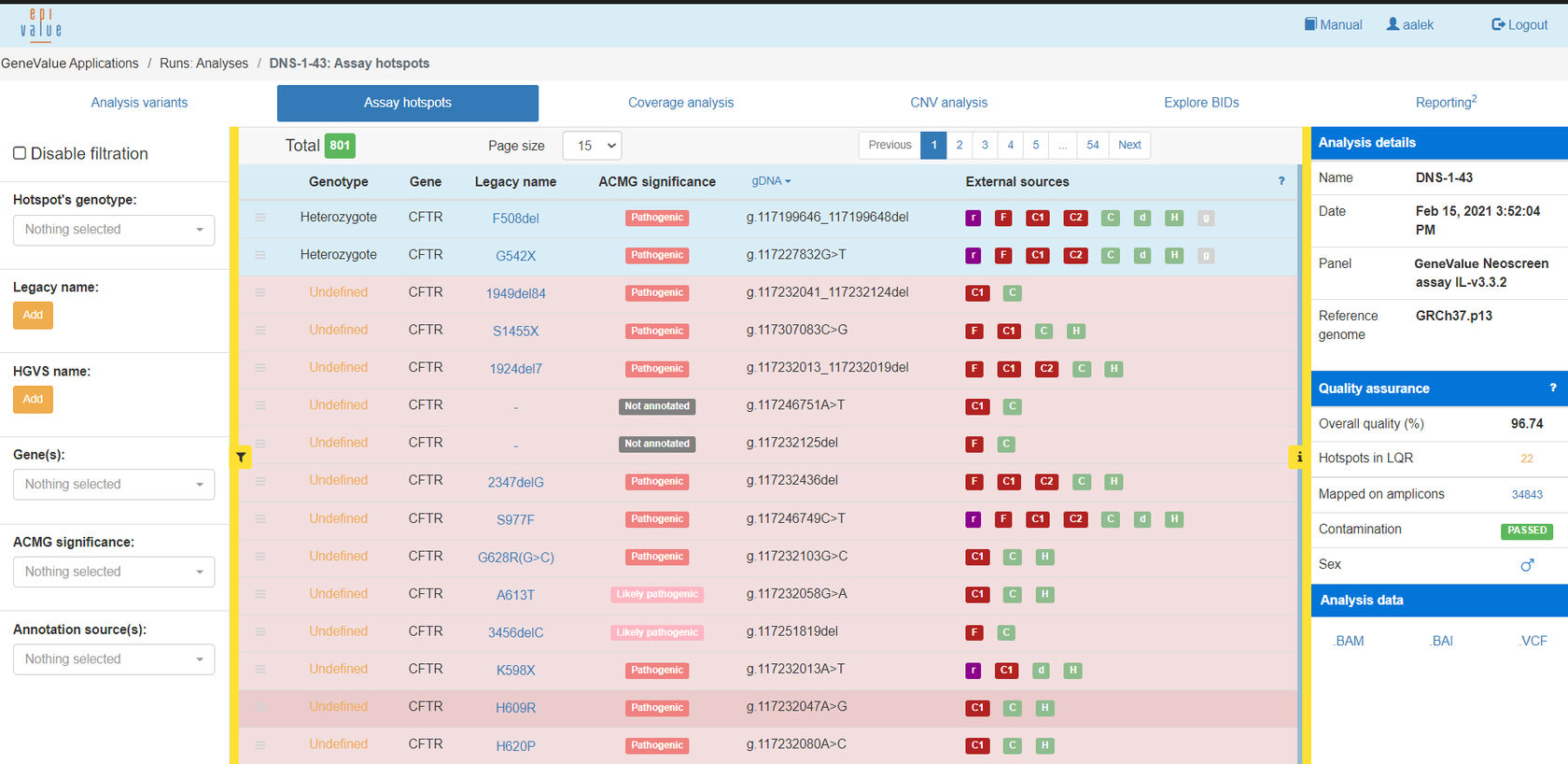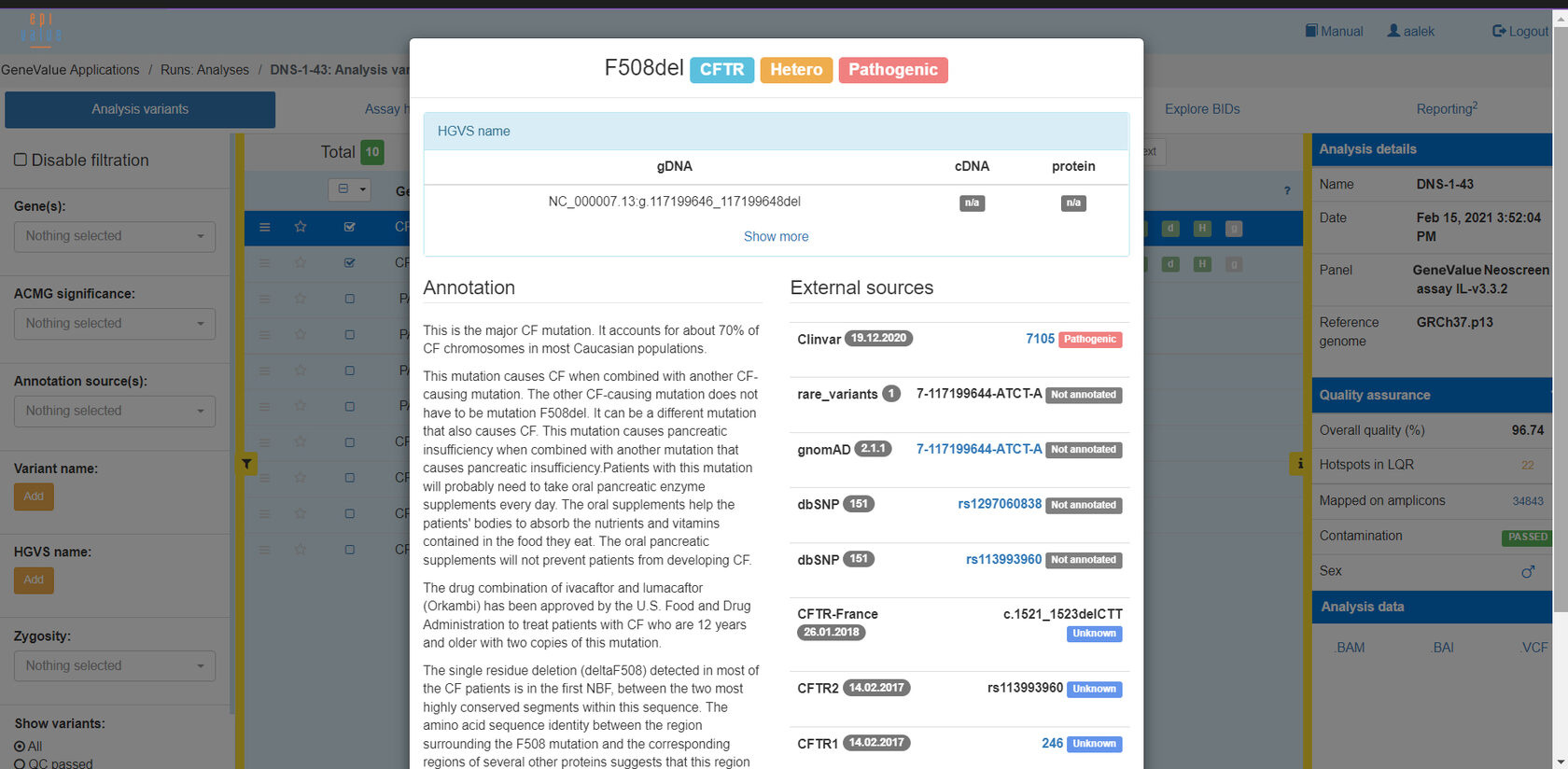 All found variants are visualised on the main working tab, indicating the gene, the trivial name of the variant, HGVS nomenclature, zygosity, ACMG values and links to external databases. The drop-down tabs contain parameters for filtering and flexible search, analysis details, basic information about passing quality control, as well as buttons for uploading data in the .BAM, .BAI, .VCF format. Automatic quality control parameters are displayed in the launch workspace: