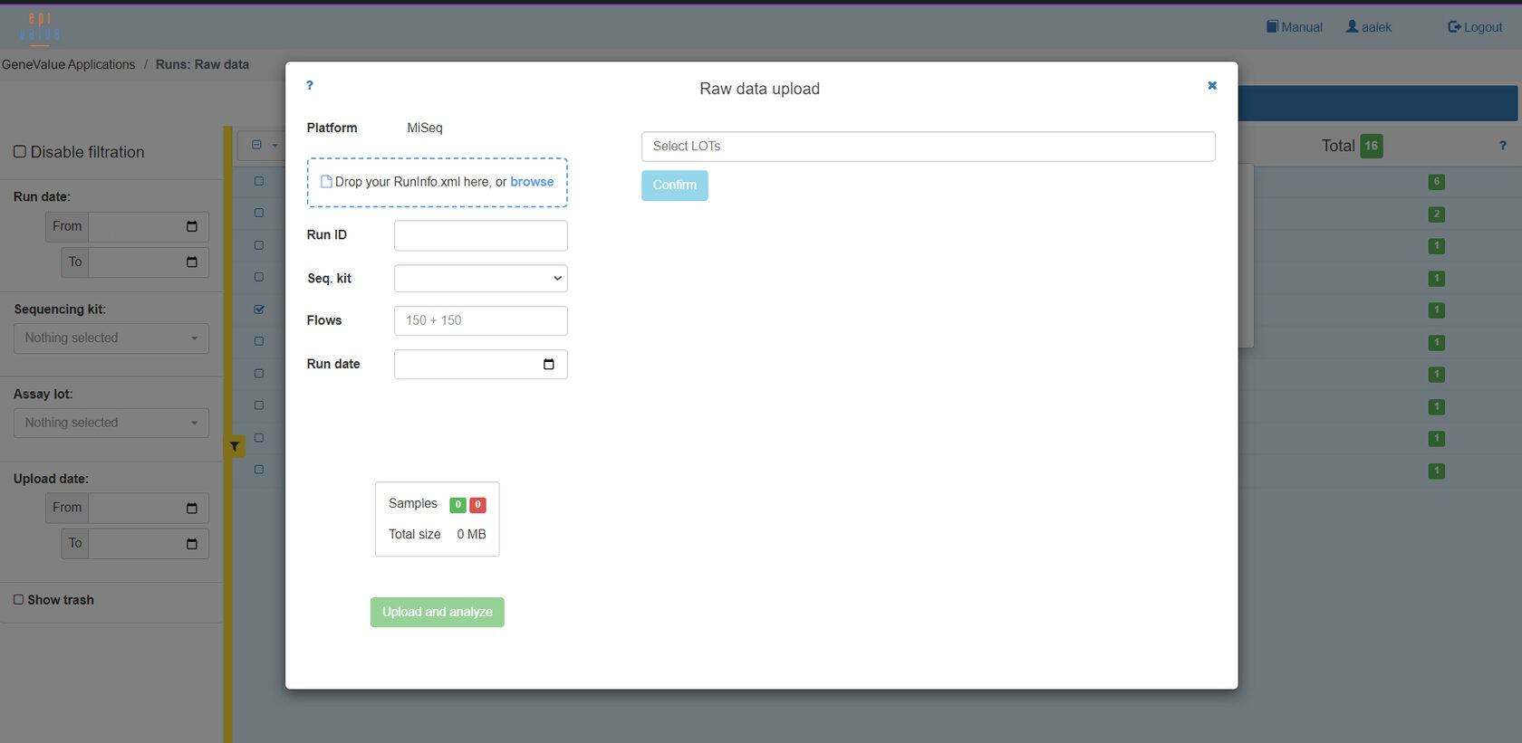 The data upload interface allows the importation of sequencing results and initialisation information. The assay can be run simply by entering the reagent batch number. All files can be uploaded via the "browse" button or simply by dragging and dropping the relevant file into the active field.