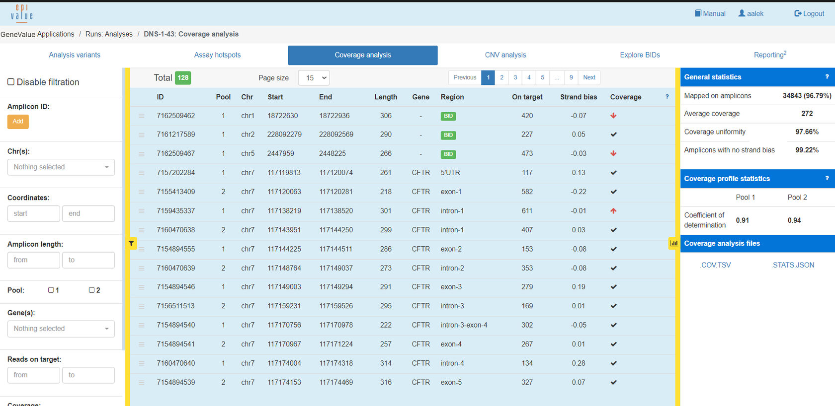 The Coverage Analysis tab displays the number of reads along with strand bias and a special “Coverage” parameter that compares current coverage with the reference standard for each amplicon.