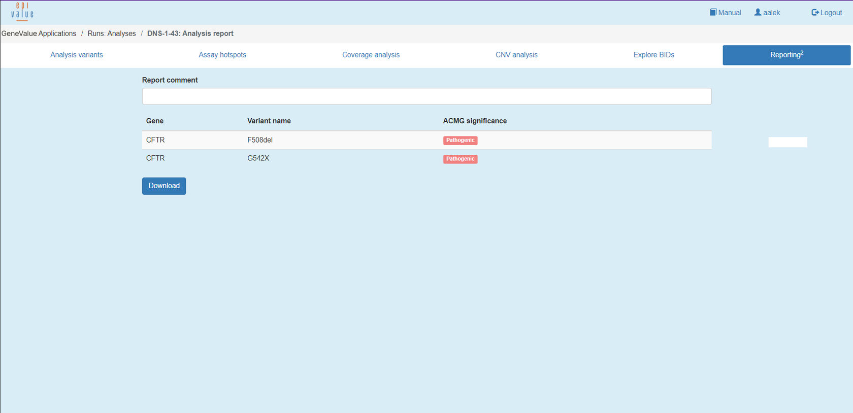 The system generates a report indicating the analysed genes, found variants and quality parameters.